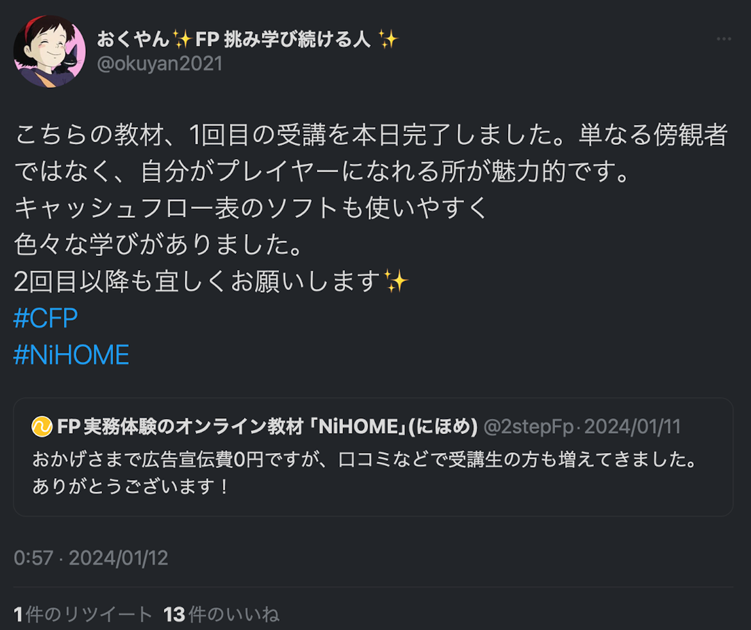 NiHOMEさんの最大の魅力は、本来ならば実務でしか身につけることができない「FPを仕事にする力」を簡単に学べるという点だと思います。