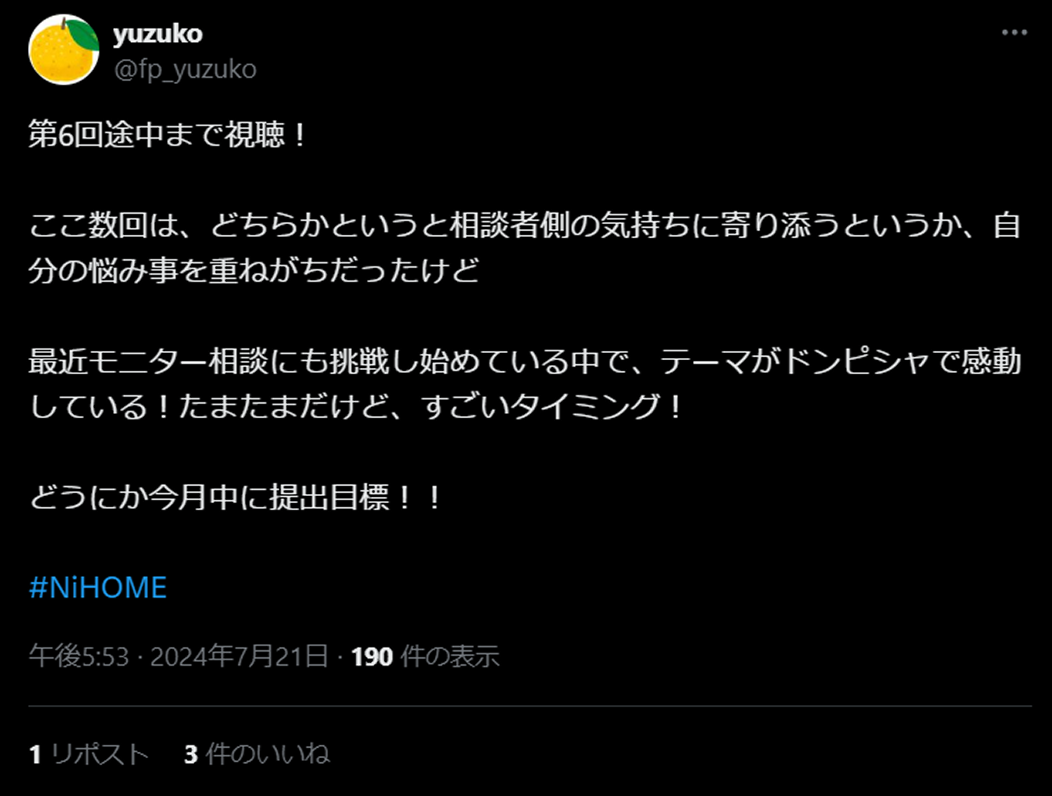NiHOMEの教材は、他のものと違い、事例をストーリーとして疑似体験できるところが優れていると思います。実務に近い形で、実際の面談にすぐに活かせるポイントが満載であるところは、この教材独自の良さではないかと感じます。